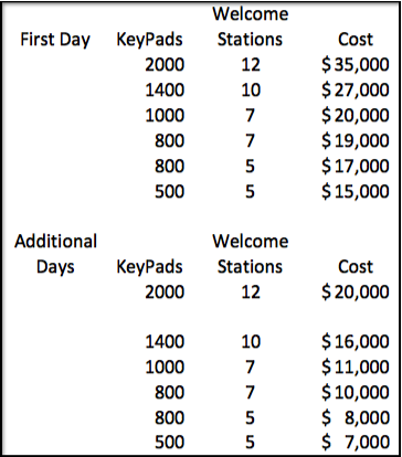 3. We can help to minimize our costs by (a) having volunteers help with check-in and check-out and (b) try to always get better at predicting the minimum number of keypads to order which is the primary parameter that drives the equipment and personnel leasing costs.