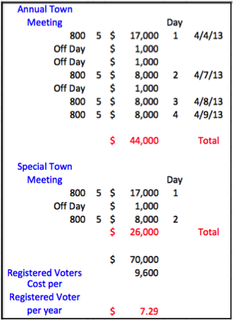 If we apply the previous leasing price list (above) to our last April town meeting 2013 and also project a fall town meeting 2013 being two days with one 'off day' and attended by no more than 800 citizens we get: