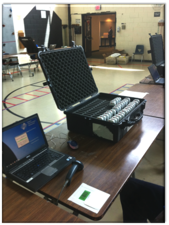 The check-in process is an enhancement and addition over the paper box-check system that we have now. The state provided paper checklist system has a unique alphanumeric bar-code for each registered voter. This bar-code is scanned by hand at the time of check-in and registered into a welcome computer (which is just a laptop with special software). The voter is associated with the keypad by an external bar-code on the keypad BUT the actual vote is associated with an internal MAC address of the keypad.