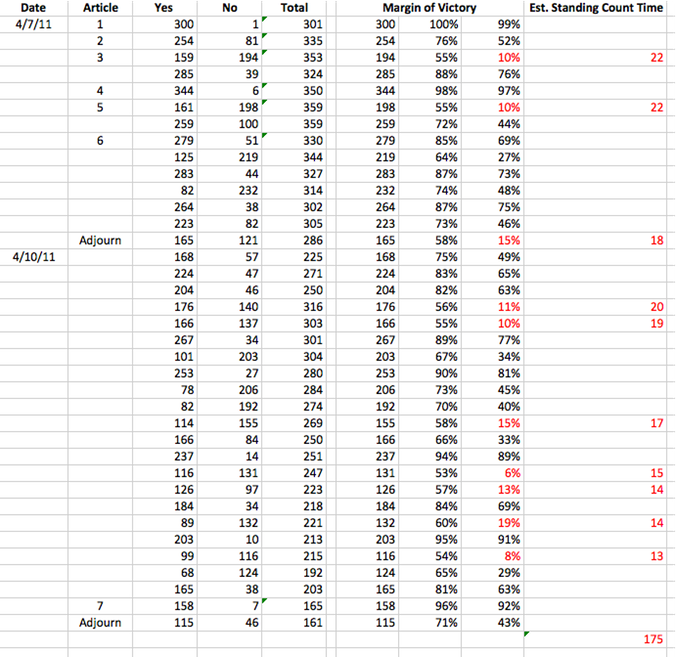 Annual Town Meeting April 2011 on day 4/7 and 4/10 considered 7 articles.