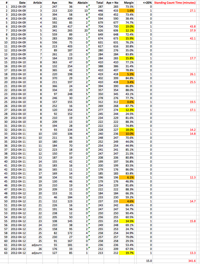 The total SCV value was 342 minutes. There were 59 actual electronic votes of which each took 1 minute. The difference between 341 and 59 is 282 minutes or 4 hours; 42 minutes of town meeting time saved. Clearly we saved at leasts ONE complete session of town meeting since it would have carried into a fifth session.