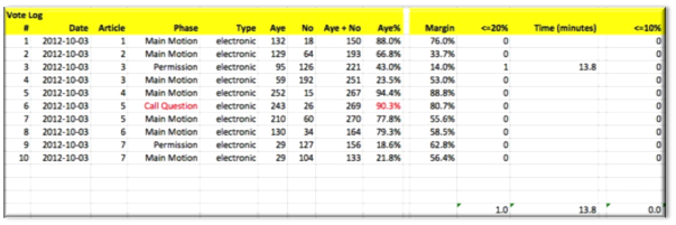 The total SCV value was 14 minutes. There were 10 actual electronic votes of which each took 1 minute. The difference between 14 and 10 is 4 minutes of town meeting time saved.